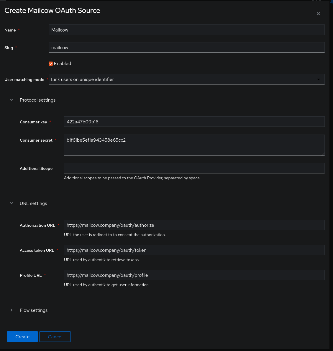 - Under Directory -> Federation & Social login Click Create > Mailcow OAuth Source